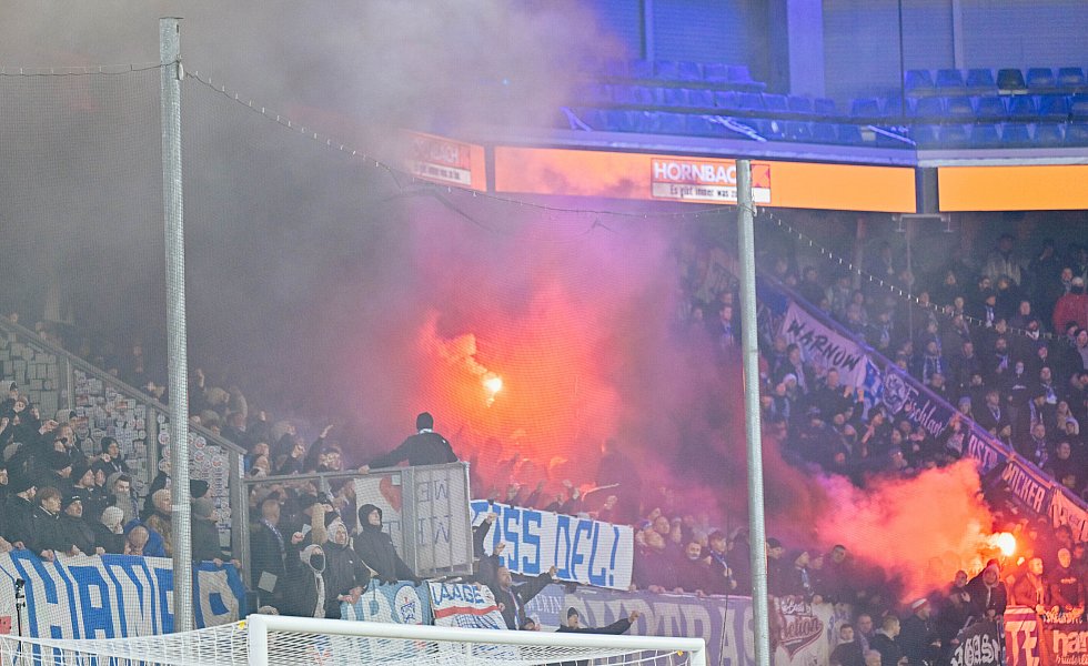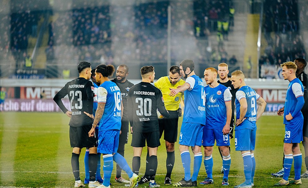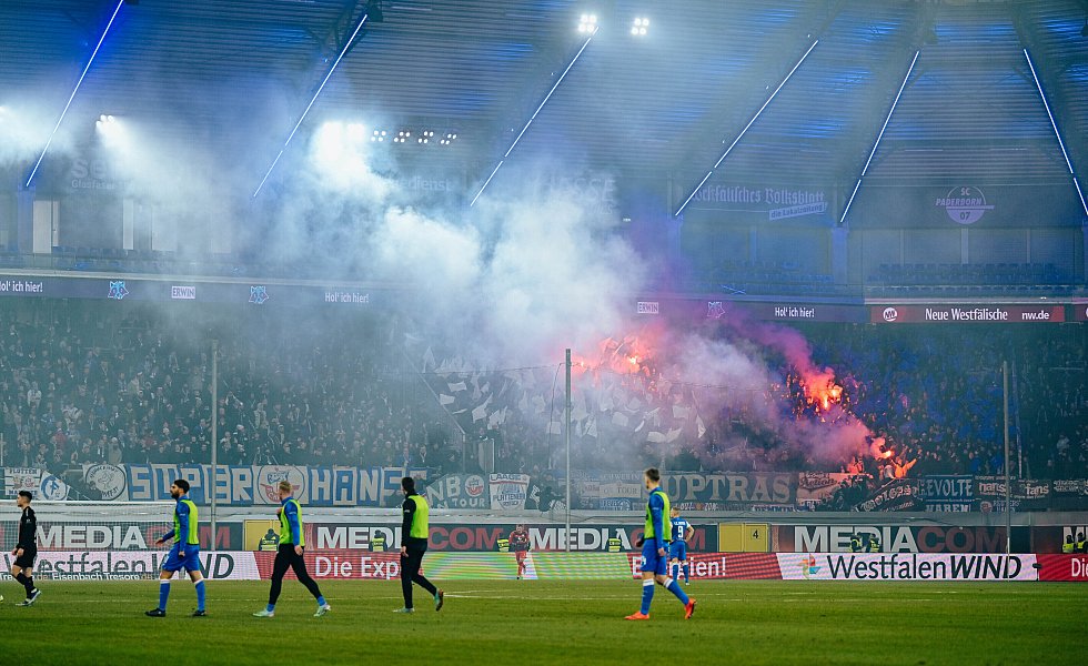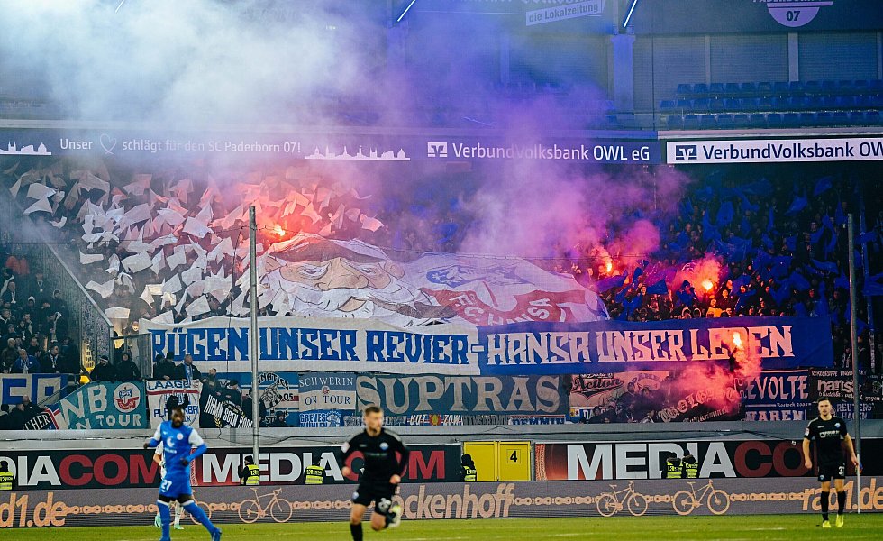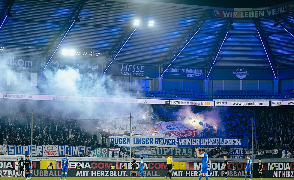 Paderborn. Das Zweitligaspiel zwischen dem SC Paderborn und dem FC Hansa Rostock stand am Freitagabend kurz vor dem Abbruch. Dafür sorgten die Pyrotechnik-Exzesse der Gäste-Fans, die im Stadion zudem einen erheblichen Sachschaden verursachten. Doch letztlich wurde die Partie mit Unterbrechungen von insgesamt 30 Minuten Dauer doch zu Ende gebracht. Und die Hausherren konnten zum Hinrunden-Abschluss den dritten Sieg in Folge feiern. Der SCP gewann vor 12.260 Zuschauern in der Home-Deluxe-Arena mit 3:0 (1:0) und kann mit 27 Punkten entspannt in die Winterpause gehen.
