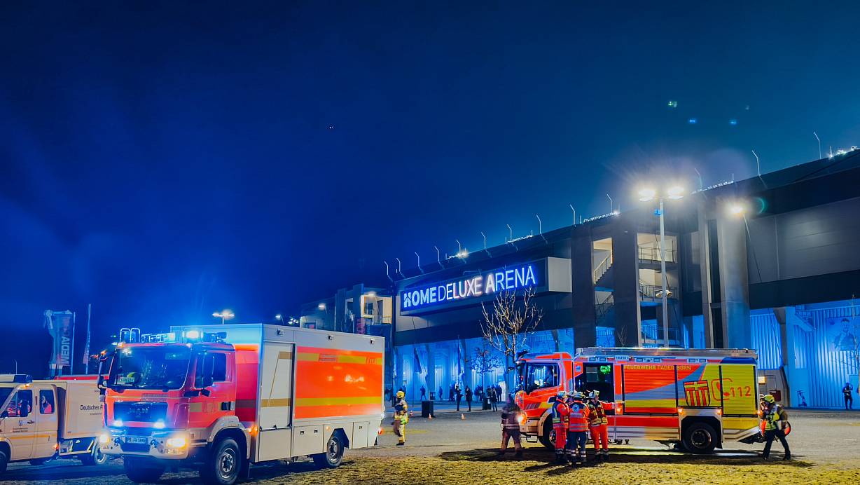 Vor der Home-Deluxe-Arena waren am Freitag unter anderem drei Feuerwehr-Löschfahrzeuge, ein Gerätewagen, drei Notarzt- und fünf Rettungswagen sowie fünf Krankentransporte angefordert worden. | © Besim Mazhiqi