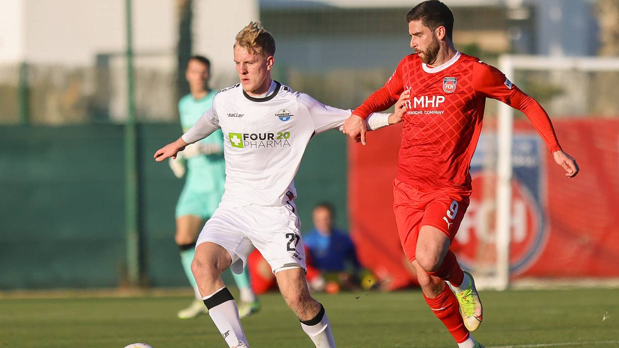 Mattes Hansen (links, hier im Duell mit Heidenheims Stefan Schimmer) arbeitet im spanischen Trainingslager daran, wieder auf das Niveau zu kommen, das er in der Hinserie schon öfter gezeigt hat. | © Oliver Krato