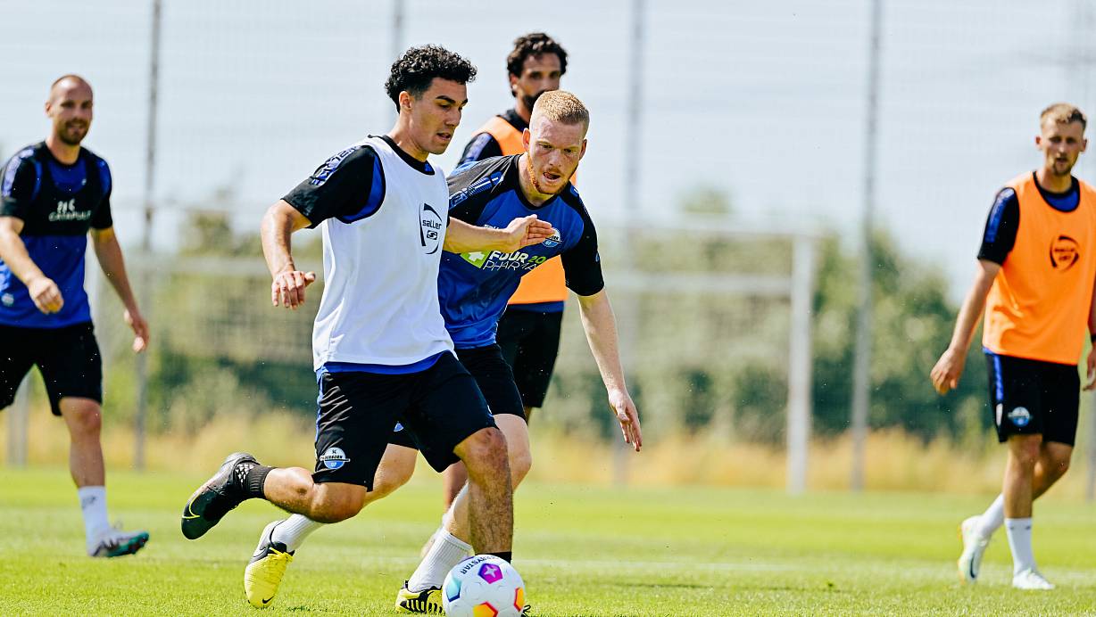 Niclas Nadj (vorne) gegen Kai Klefisch beim Trainingsauftakt des SC Paderborn in der Saison 2023/24. | © BESIM MAZHIQI