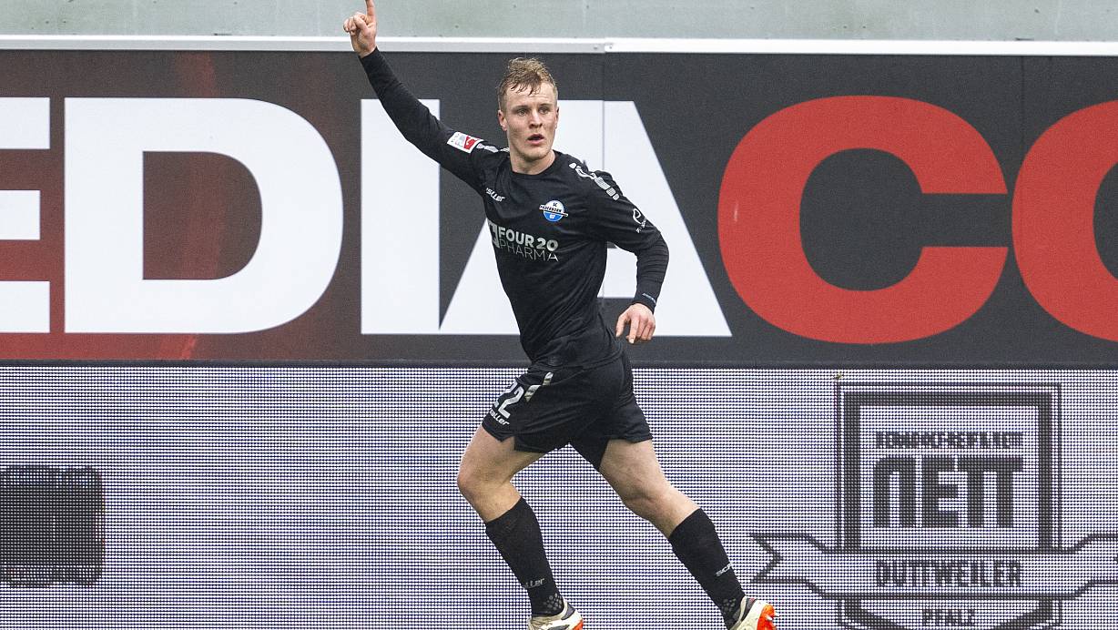 Mattes Hansen jubelt nach seinem Tor zum 2:0 in der Heimpartie gegen Fortuna Düsseldorf. | © David Inderlied/dpa