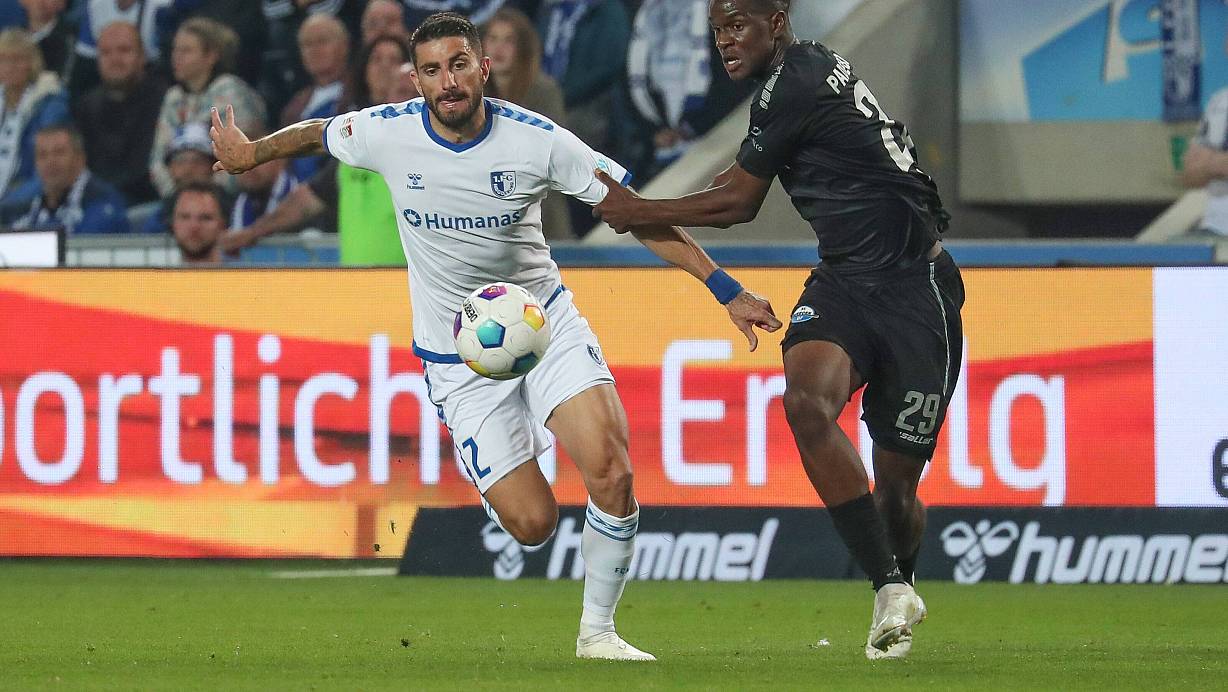 Bei seinem Zweitligadebüt in Magdeburg bekam es Ilyas Ansah (r.) am 22. September 2023 gleich mit dem italienischen Ex-Nationalspieler Cristiano Piccini zu tun. | © Imago Images