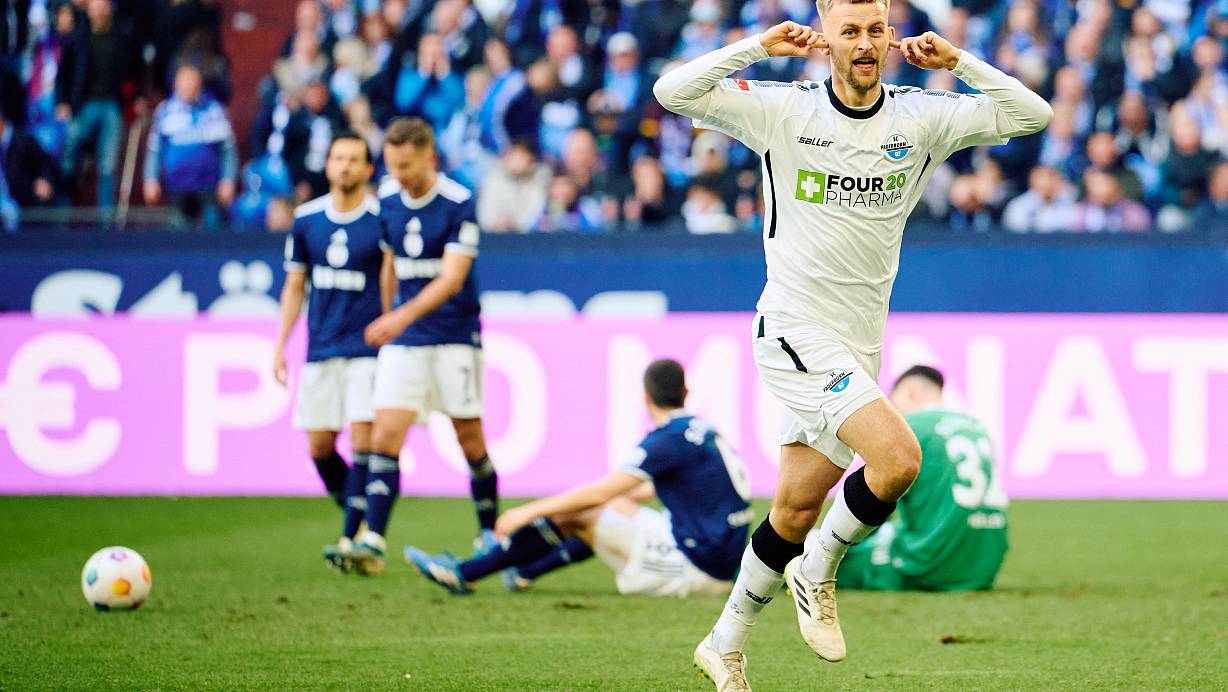SCP-Joker Sebastian Klaas bejubelt seinen 3:2-Treffer, während die Schalker enttäuscht am Boden liegen. | © dpa