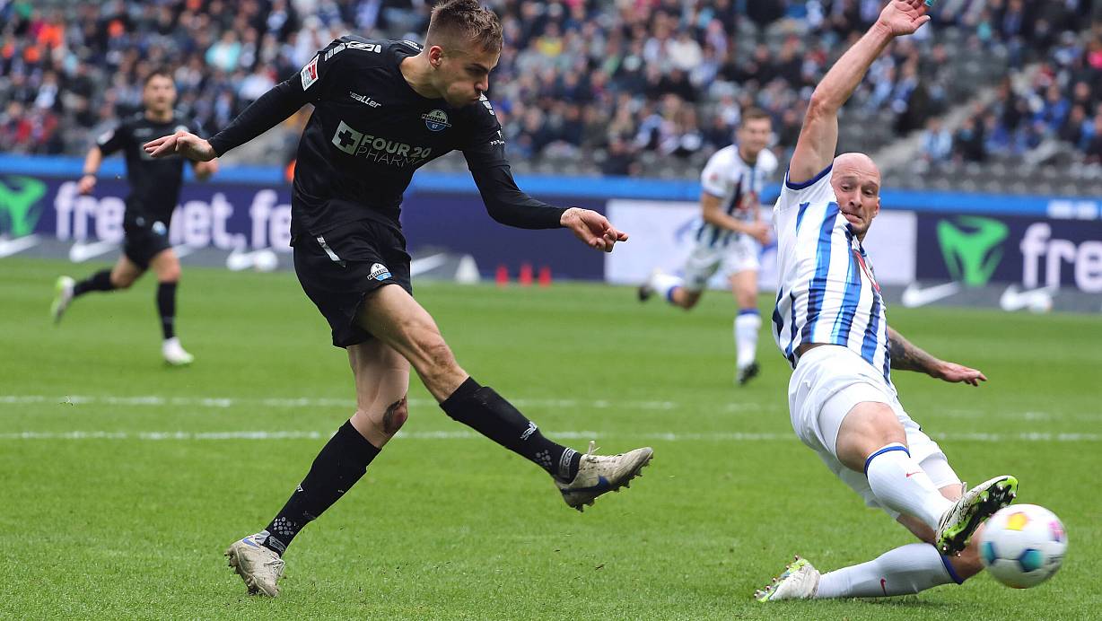 In der vergangenen Saison kassierten SCP-Stürmer Filip Bilbija (l.), hier gegen Hertha-Kapitän Toni Leistner, und seine Teamkollegen eine 1:3-Niederlage in Berlin. Am Samstag gibt es die Gelegenheit zur Revanche. | © Imago Images