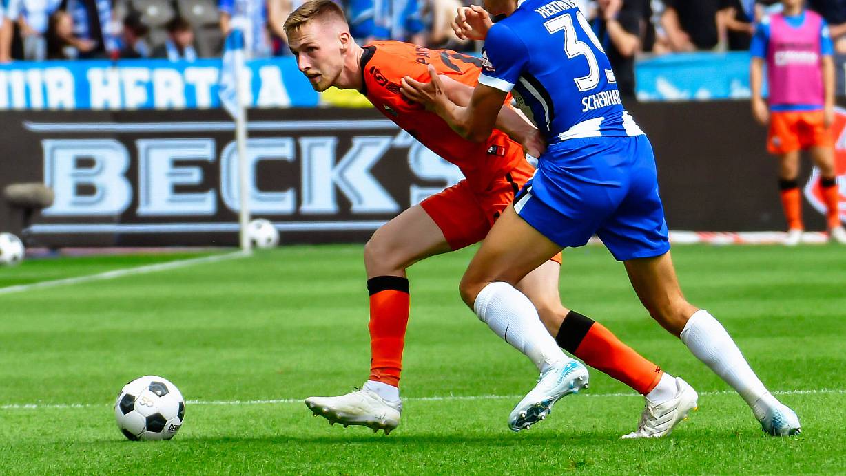 SCP-Verteidiger Tjark Scheller (l.), hier im Duell gegen den Herthaner Derry Scherhant, feierte am Samstag sein Zweitliga-Startelfdebüt. | © Imago Images