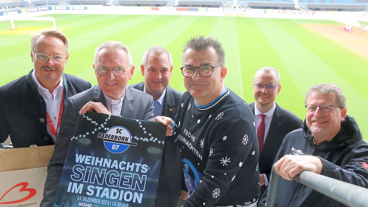 (v. l.) Elmar Kloke (Bürgerstiftung Paderborn), Domkapitular Benedikt Fischer, Christian Nolden (Dommusik), SCP-Geschäftsführer Martin Hornberger, Patrick Cellnik (Dommusik) und Dietmar Pannenberg (Blechwerkstatt) freuen sich auf die Premiere des Paderborner Weihnachtssingen, das am 14. Dezember in der Home-Deluxe-Arena steigt. | © Frank Beineke