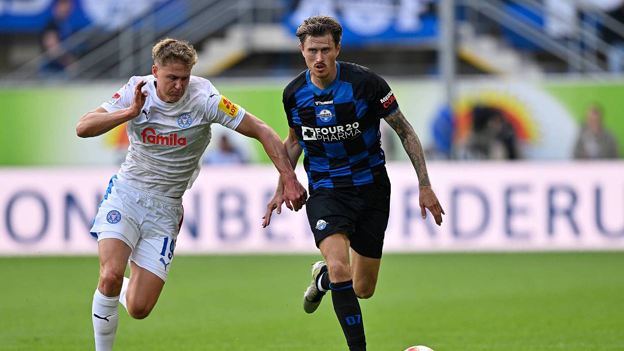Calvin Brackelmann (rechts) setzt sich im Zweikampf mit Kiels Phil Harres durch. Am Ende siegte der SC Paderborn mit 2:1. | © Imago Images