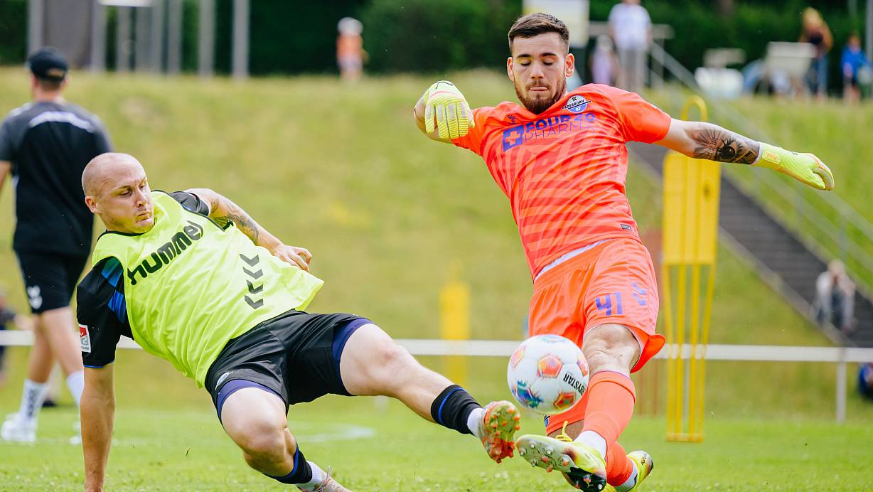 SCP-Stürmer Sven Michel (l.), hier beim Trainingsauftakt gegen Torwart Dennis Seimen, kann nun bei den Übungseinheiten wieder voll durchziehen. | © BESIM MAZHIQI