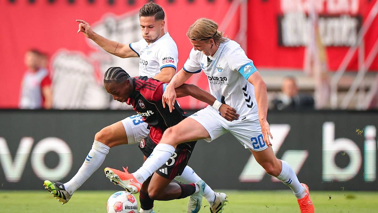 SCP-Kapitän Felix Götze (r.) und Marcel Hoffmeier, der später eine schwere Knieverletzung erlitt, hatten ihre liebe Müh und Not mit dem pfeilschnellen Nürnberger Mohamed Ali Zoma. | © dpa