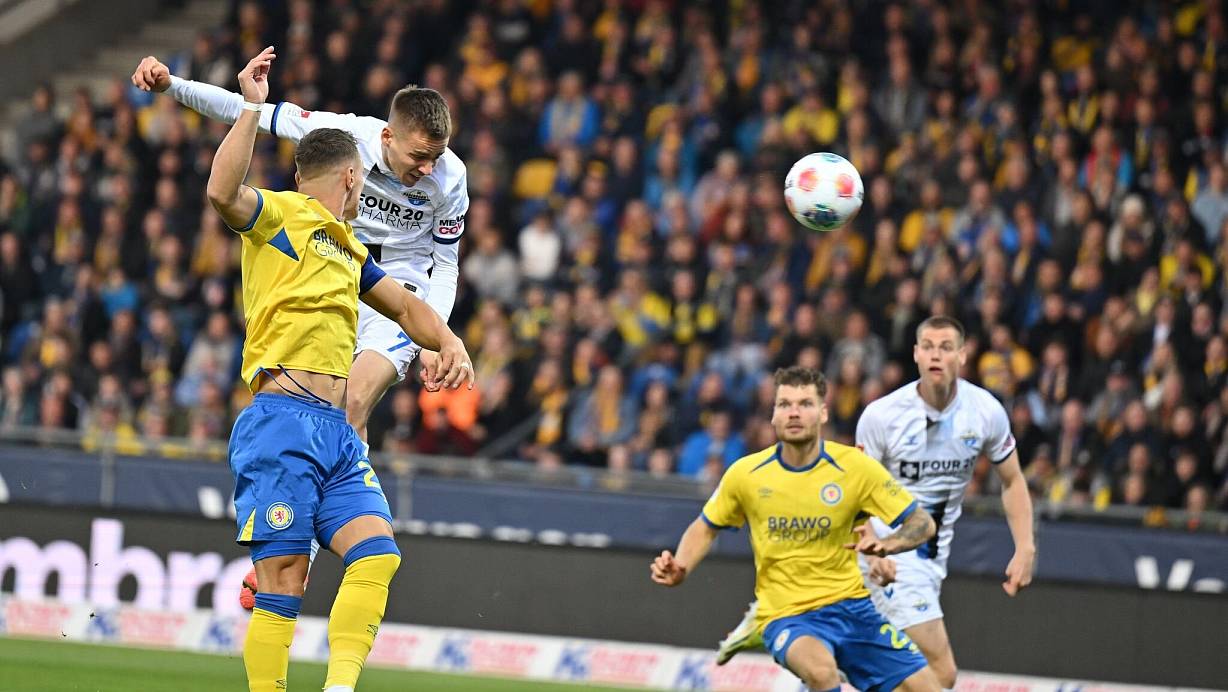 Filip Bilbija köpft nach nur 30 Sekunden zur 1:0-Führung für den SC Paderborn ein, der am Ende dank eines späten Joker-Treffers mit 2:1 gewann. | © dpa