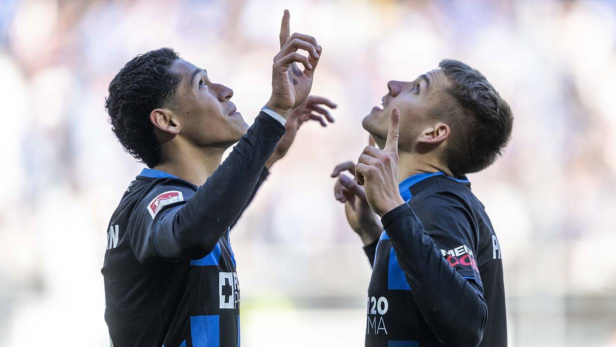 Die Spieler des SC Paderborn feierten beim 4:3 über Arminia Bielefeld ihren fünften Sieg in Folge und peilen jetzt einen historischen sechsten Sieg an. Hier jubeln Santiago Castañeda (l.) und Filip Bilbija nach dessen Tor zum zwischenzeitlichen 3:2. | © picture alliance/dpa