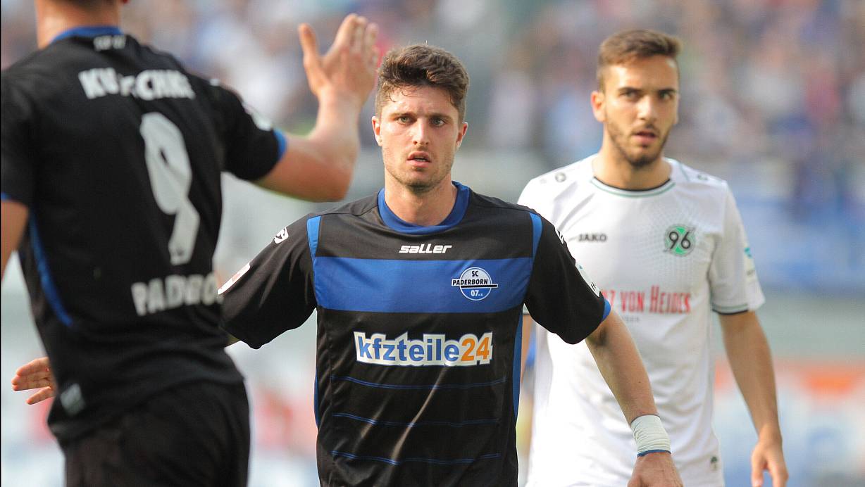 Moritz Stoppelkamp (Mitte) erzielte in Paderborns erster Bundesliga-Saison gegen Hannover 96 ein Tor aus über 82 Metern. Hier klatscht er mit Stefan Kutschke ab, während Hannovers Kenan Karaman (rechts) zuschaut. | © picture alliance / dpa