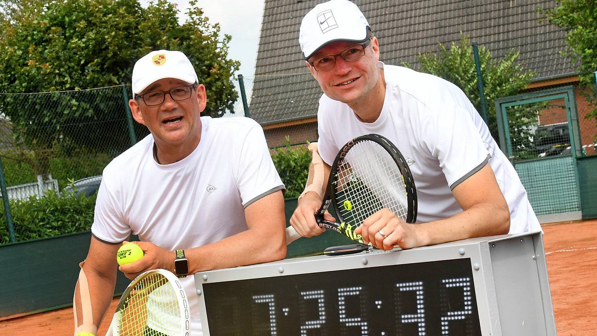 Twistringen (dpa/lnw). Zuschauer werden Muskelkater im Hals bekommen, wenn sie dieses Tennis-Match in voller Länge verfolgen wollen: 82 Stunden lang wollen zwei Sportler im niedersächsischen Twistringen gegeneinander spielen. Einen Weltrekord im Einzeltennis wollen Christian Masurenko (49) und Dennis Heitmann (34) damit aufstellen. Am Donnerstag um 8.00 Uhr hat die Partie begonnen, zu Ende gehen soll sie am Sonntag um 18.00 Uhr. Schlafen, Essen, Toilettengänge - dafür bleiben den beiden während der dreieinhalb Tage immer nur wenige Minuten. Kein Problem, sagte Masurenko vor Beginn des Spiels: „Das ist eine mentale Sache."