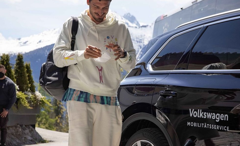 Die Rio-Weltmeister Müller und Hummels wurden vom DFB-Fahrdienst zum Teamquartier gebracht. Der lässig in weißen Shorts ins Quartier schlendernde Hummels war dabei einige Minuten schneller als der von Kapitän und Bayern-Kollege Manuel Neuer begleitete Müller. Gute-Laune-Typ Müller lächelte unter seiner FFP2-Maske in der Tiroler Mittagssonne und winkte kurz in Richtung der Kameras und Fotografen. «Beide haben eine tolle Saison gespielt, beide sind große Persönlichkeiten», sagte Bierhoff und schloss für die EM ab 11. Juni seine Erwartung an, gemeinsam «tolle Erfolge» zu feiern.