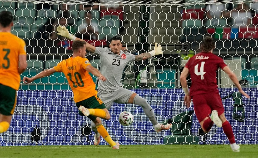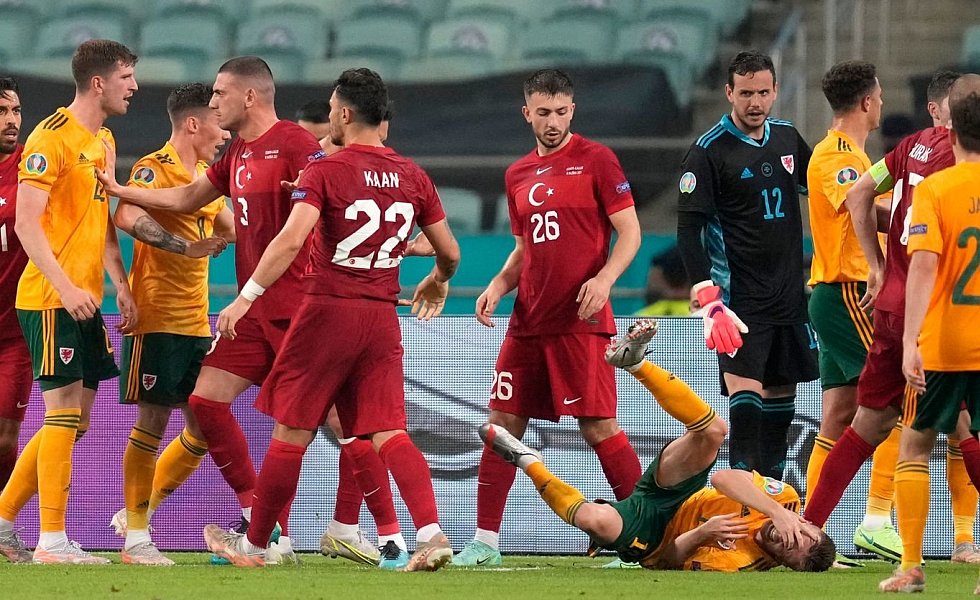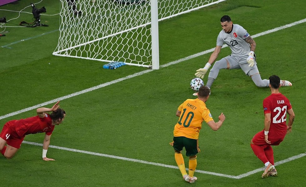 Die Euphorie von den Rängen aber übertrug sich nur sporadisch. Wales' Mittelfeldspieler Joe Morrell klärte zweimal vor der Torlinie gegen Ayhan (30.) und Caglar Söyüncü (31.). Doch mitten in einer Phase von türkischer Dominanz schlug Wales zu: Zum dritten Mal bediente Bale seinen Offensivpartner Ramsey, der diesmal Cakir spielerisch überwand und dem EM-Halbfinalisten von 2016 eine 1:0-Pausenführung bescherte.