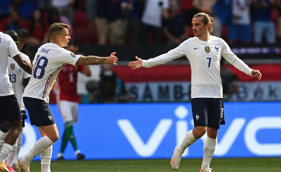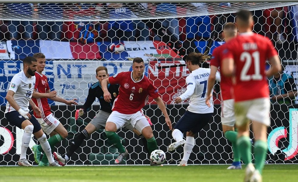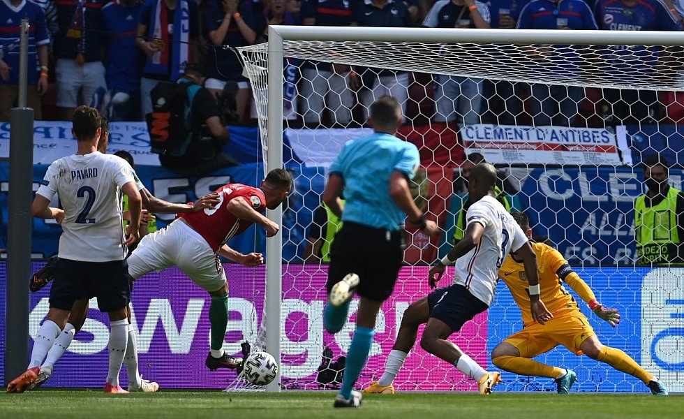 In der 31. Minute sorgten Griezmann, Mbappè und Benzema im Zusammenspiel für einen spielerischen Höhepunkt, an dessen Ende Real-Madrid-Stürmer Benzema knapp am Tor vorbei schoss. Der Weltmeister dominierte spätestens von diesem Zeitpunkt an die Partie, hatte 67 Prozent Ballbesitz, verlor sich aber oft in Schönheit. Ungarn hingegen glänzte in der Nachspielzeit der ersten Hälfte mit Effizienz: Die erste Torchance nach Doppelpass mit dem Freiburger Roland Sallai nutzte Attila Fiola zum 1:0, nachdem er dem Münchner Benjamin Pavard entwischte, und sorgte für bedröppelte Gesichter bei den hochgelobten Franzosen.
