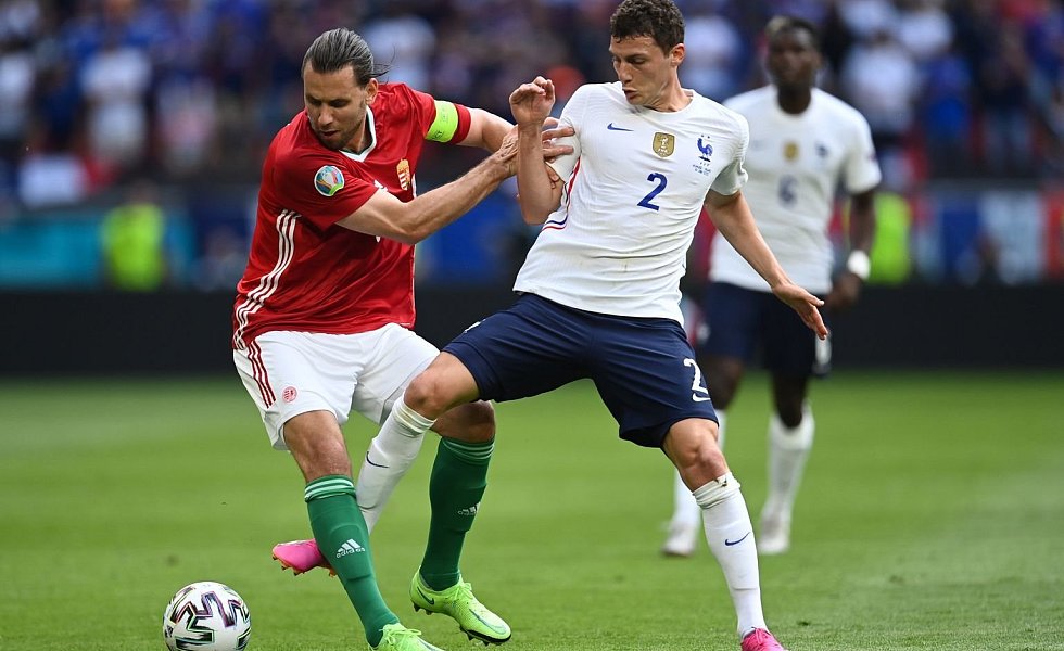 Ungarns Adam Szalai (l) kämpft mit Frankreichs Benjamin Pavard um den Ball. | © Foto: Robert Michael/dpa-Zentralbild/dpa
