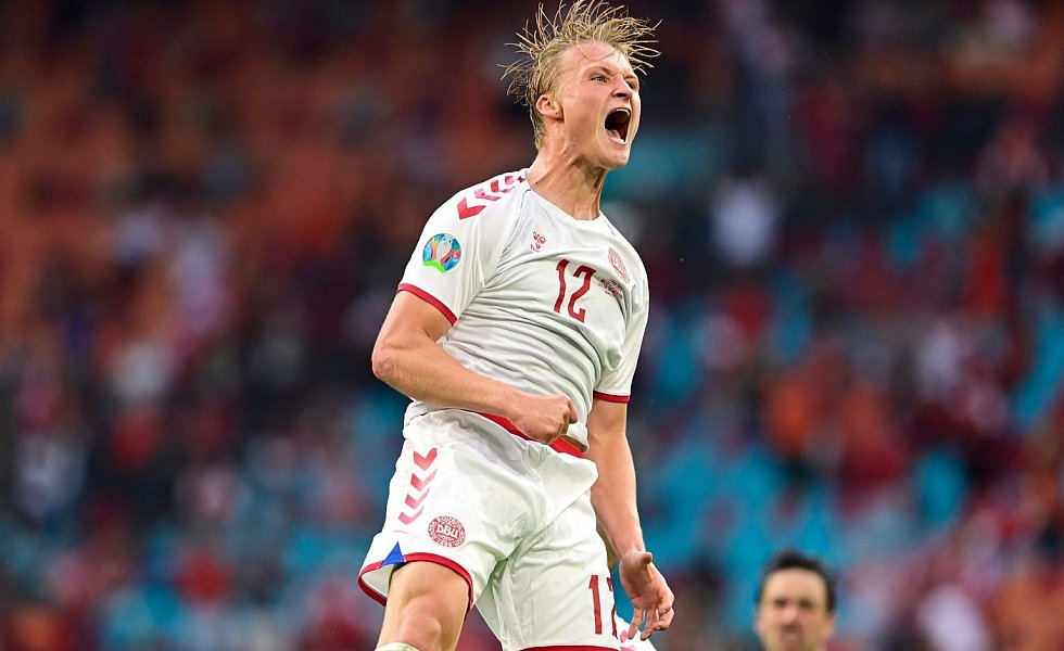 Im ersten K.o.-Spiel der Fußball-Europameisterschaft trafen der frühere Ajax-Profi Dolberg (27. und 48. Minute), Joakim Maehle (88.) und Martin Braithwaite (90.+6). Die Skandinavier fordern nun am Samstag in Baku den Gewinner der Partie Niederlande - Tschechien.