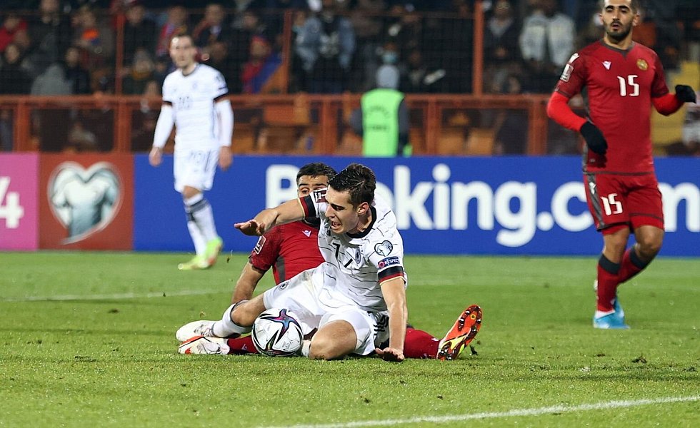 Zwischendrin gab es aber erneut Sorglosigkeiten der DFB-Auswahl in der Rückwärtsbewegung. Hatte Khoren Bayramyan bereits eine gute Gelegenheit (56.), verhalf schließlich ein von Neuhaus verursachter Foulelfmeter den Gastgebern zum ersten Torerfolg. Der frühere Dortmunder Mkhitaryan verwandelte sicher und sorgte dafür, dass Neuer-Ersatz Marc-André ter Stegen auch in seinem dritten Einsatz in der laufenden Qualifikation hinter sich greifen musste. Bei Neuer hatte indes sieben Mal die Null gestanden.