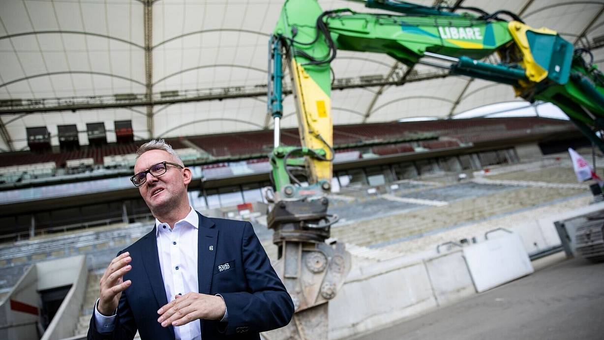 Die umfangreichen Bauarbeiten an der Haupttribüne nahmen mit dem so genannten Baggerbiss offiziell ihren Anfang, teilte die Stadion NeckarPark GmbH & Co KG mit. Sie und die Stadt Stuttgart investieren 97 Millionen Euro in den Umbau. Weitere 1,5 Millionen Euro fallen für eine Photovoltaik-Anlage im Dachbereich des Stadions an. Die Erneuerung der Haupttribüne soll bis Ende November 2023 und damit ein halbes Jahr vor EM-Beginn abgeschlossen sein.
