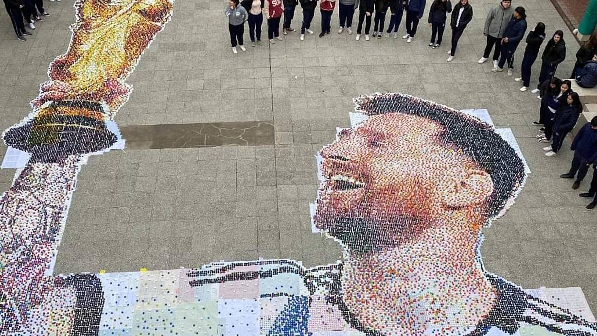 Knapp neun Monate nach dem Titelgewinn der argentinischen Fußball-Nationalmannschaft bei der Weltmeisterschaft in Katar haben Schüler in Argentinien Stürmerstar Lionel Messi mit einem Mosaik aus Schraubverschlüssen geehrt.