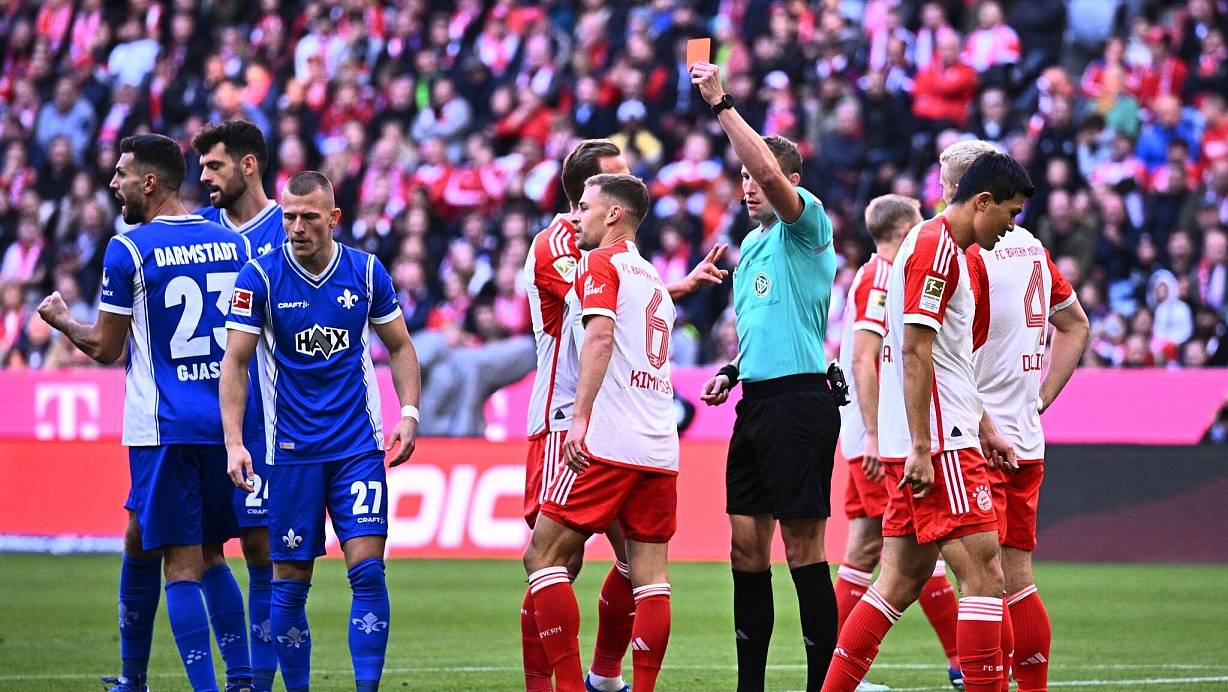 Kimmich hatte Lilien-Spieler Marvin Mehlem nach einer unsauberen Ballannahme kurz vor dem eigenen Strafraum zu Boden gezogen. Schiedsrichter Martin Petersen stellte den Mittelfeldspieler für seine Notbremse frühzeitig vom Platz.