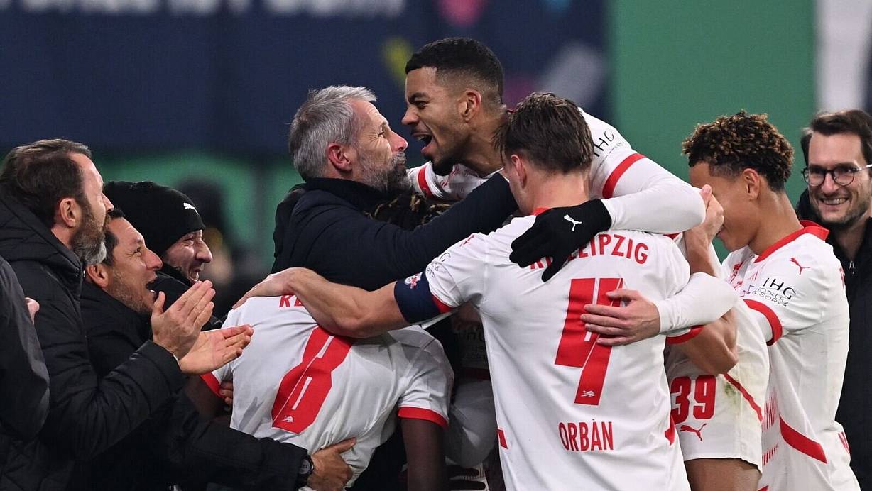 Die Leipziger Profis um die Torschützen Benjamin Sesko (31. Minute) und Loïs Openda (50./58.) setzten ein deutliches Zeichen für Rose. Die Mannschaft feierte vor allem den dritten Treffer ausgiebig mit ihrem nach zuvor sechs sieglosen Pflichtspielen in die Kritik geratenen Coach.