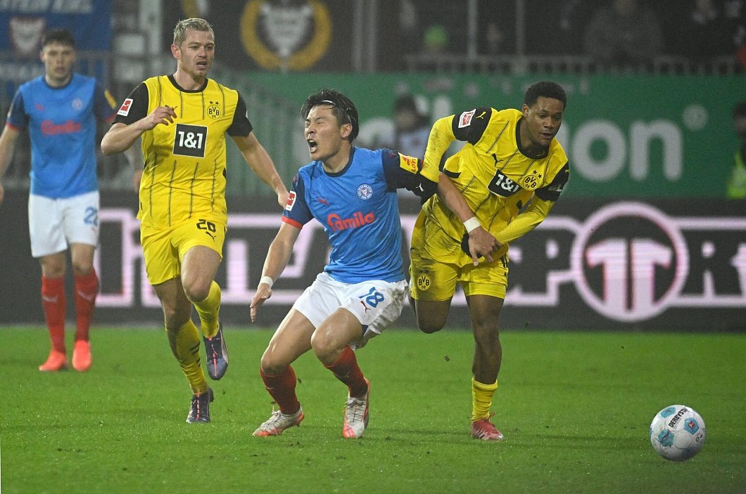 Für phasenweise furios aufspielende Kieler, die als Vorletzter nun elf Punkte gesammelt haben, trafen Shuto Machino (27. Minute), Phil Harres (32.) und Alexander Bernhardsson (45.+4). Nach dem Wechsel verkürzten Giovanni Reyna (71.) und Jamie Gittens (77.), Kiels eingewechselter Routinier Lewis Holtby sah wegen groben Foulspiels die Rote Karte (86.). Fiete Arp (90.+8) sorgte für die Entscheidung per Weitschuss ins leere Tor.