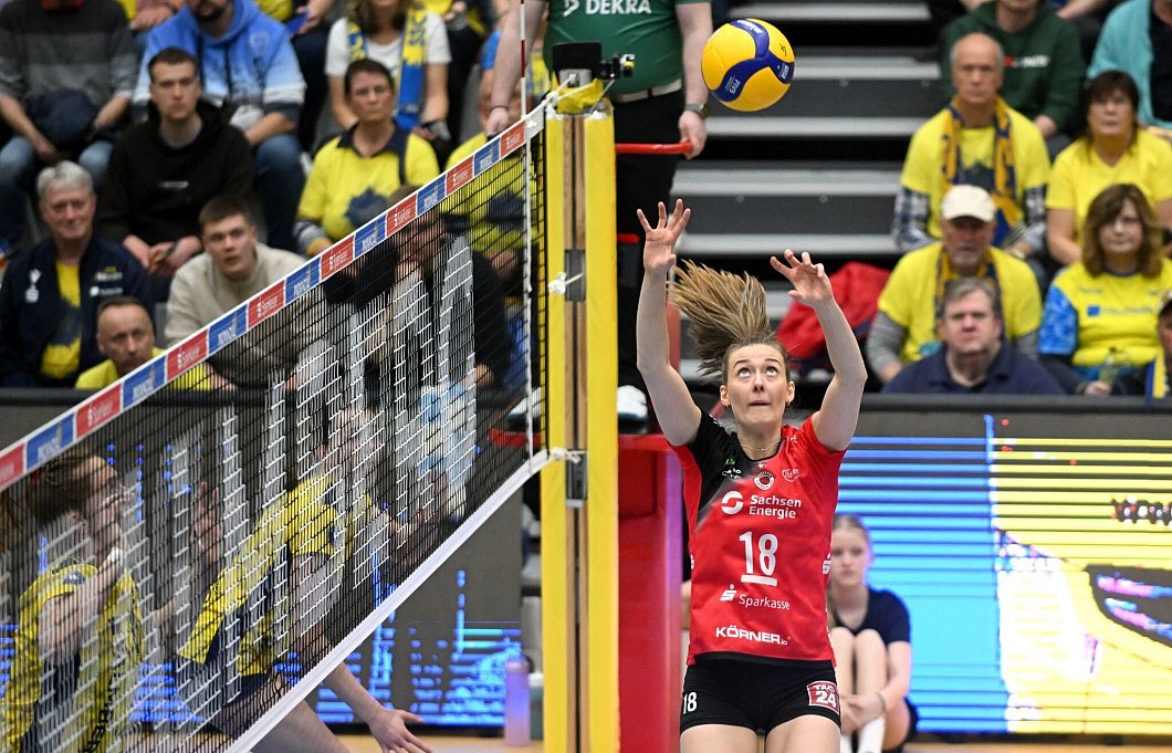 In Dresden diktierten die Gäste vor 3000 Zuschauerinnen und Zuschauern und damit ausverkauftem Haus von Beginn an das Spiel mit druckvollen Aufgaben, variablen Angriffen und einer kompakten Annahme und Abwehr das Geschehen.