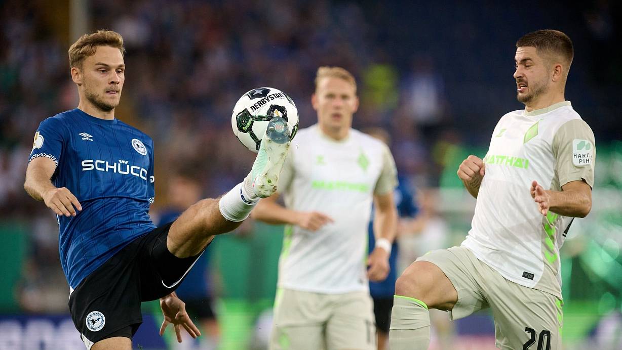 Die Gäste aus Bremen mussten im ersten Pflichtspiel unter Neu-Trainer Horst Steffen nach einer Gelb-Roten Karte gegen Leonardo Bittencourt (54.) den Großteil der zweiten Hälfte in Unterzahl spielten.