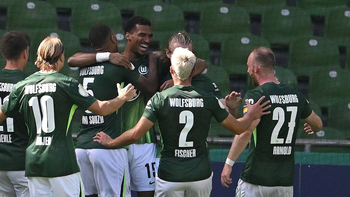 Der kurz zuvor eingewechselte Moritz Jenz (4.v.l.) traf zur Wolfsburger Führung. | © Carmen Jaspersen/dpa
