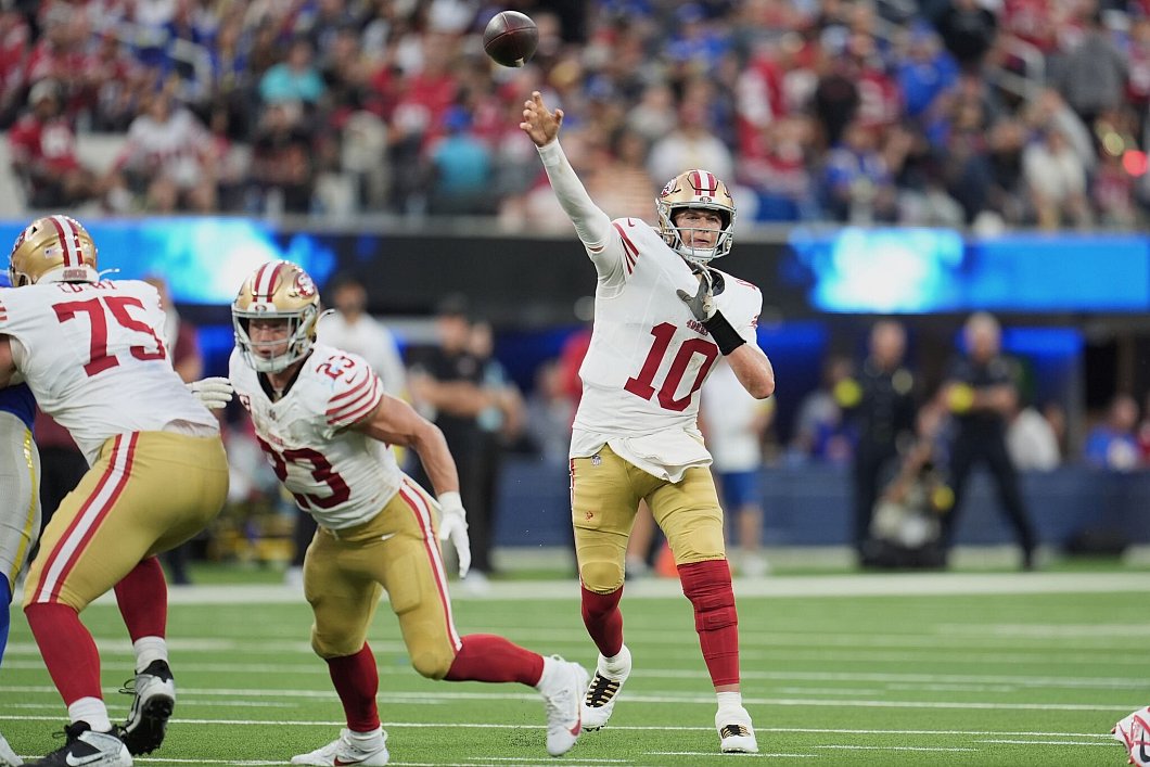 Mit einer Notbesetzung haben die San Francisco 49ers überraschend das Kalifornien-Duell der NFL bei den Los Angeles Rams gewonnen. Ohne Stamm-Quarterback Brock Purdy und eine Reihe weiterer Stars entschieden die Gäste die spannende Football-Partie im SoFi-Stadium mit 26:23 in der Verlängerung für sich. Für die 49ers war es im fünften Saisonspiel der vierte Sieg, die favorisierten Rams mussten bereits die zweite Niederlage hinnehmen.