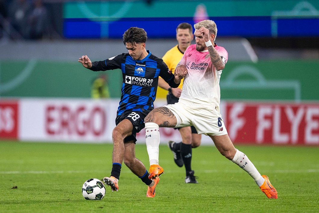 Der Außenseiter begann mutig und suchte sofort den Weg nach vorn, ein Klassenunterschied war nicht zu erkennen. Im Gegenteil: Paderborn setzte die ersten Akzente. Götze köpfte eine Flanke von Mika Baur knapp über das Tor (11.), Lucas Copado schoss ebenfalls zu hoch (14.). Baur selbst verfehlte das Ziel aus der Distanz knapp (18.), Götze zog später erneut drüber (34.).