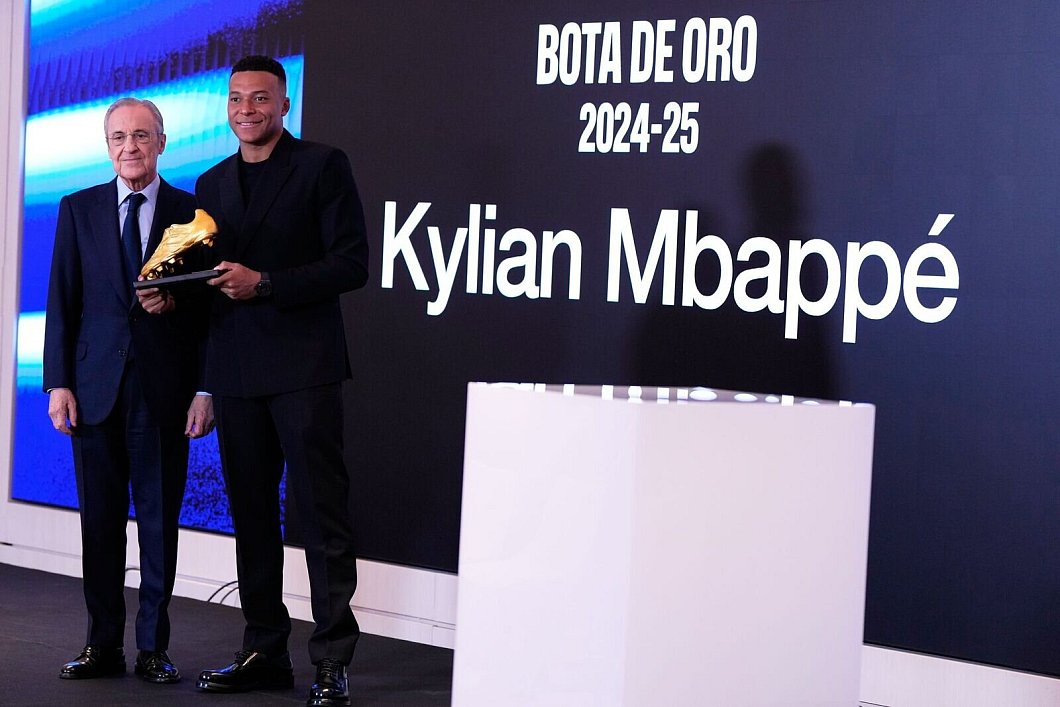 Starstürmer Kylian Mbappé ist mit dem Goldenen Schuh für den besten Torjäger der vergangenen Saison in den europäischen Fußballligen ausgezeichnet worden. Die Ehrung wurde in der Präsidentenloge des Estadio Santiago Bernabéu von Real Madrid durchgeführt, wie der spanische Rekordmeister mitteilte.