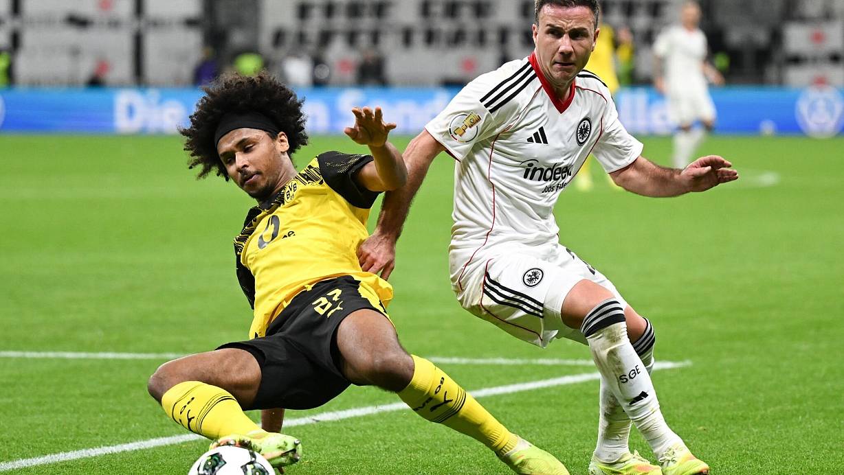 Das erste Duell im neuen Jahr: Frankfurt mit Mario Götze (r) empfängt am 9. Januar die Dortmunder um Karim Adeyemi. (Archivbild) | © Arne Dedert/dpa