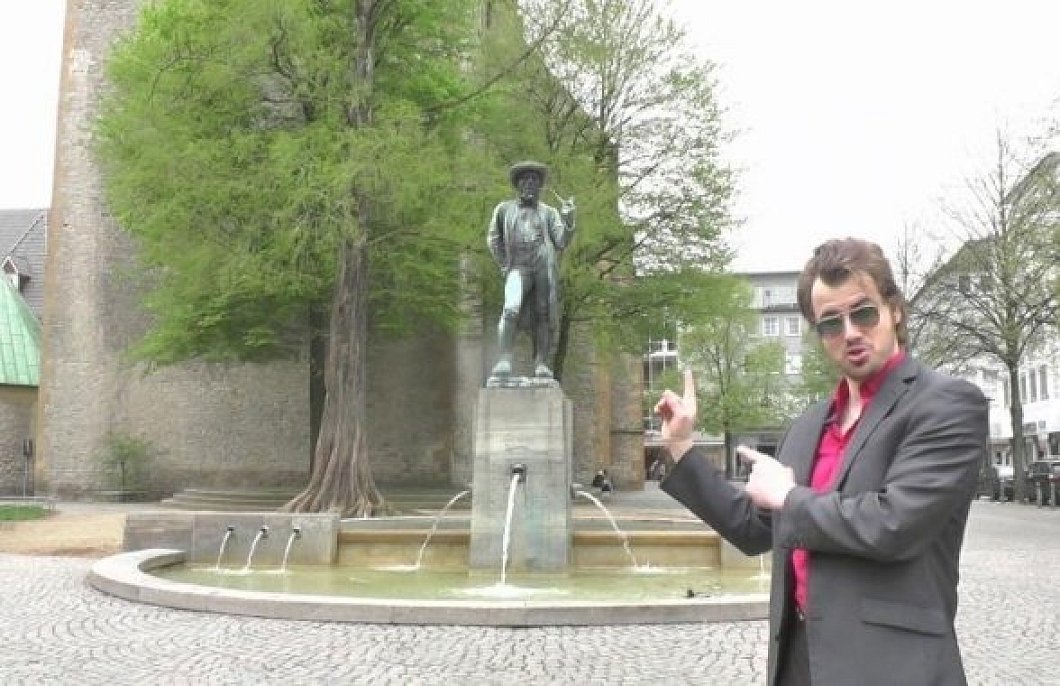 Dave Midnight alias David Müller aus dem Ruhrgebiet vor dem Leineweber-Denkmal am Altstädter Kirchplatz. Alle bekannten Plätze der Stadt hat Müller bei seinem Video-Dreh abgeklappert. | © SCREENSHOT: PRIVAT Bielefeld. Die Sparrenburg? Supergeil. Der Kesselbrink? Natürlich auch. Und der Alte Markt? Sowieso...