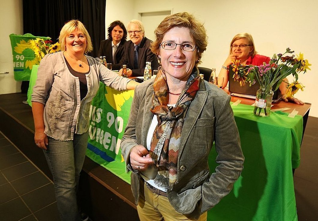 Die Grünen um Marianne Weiß, Matthi Bolte, Bernd Ackehurst und Sandra Mende (v. l.) sprachen sich gestern in einer Mitgliederversammlung einstimmig für eine erneute Kandidatur von Britta Haßelmann (vorne) aus. | © FOTO: REIMAR OTT Bielefeld. Sie ist in ihrer Partei unumstritten...