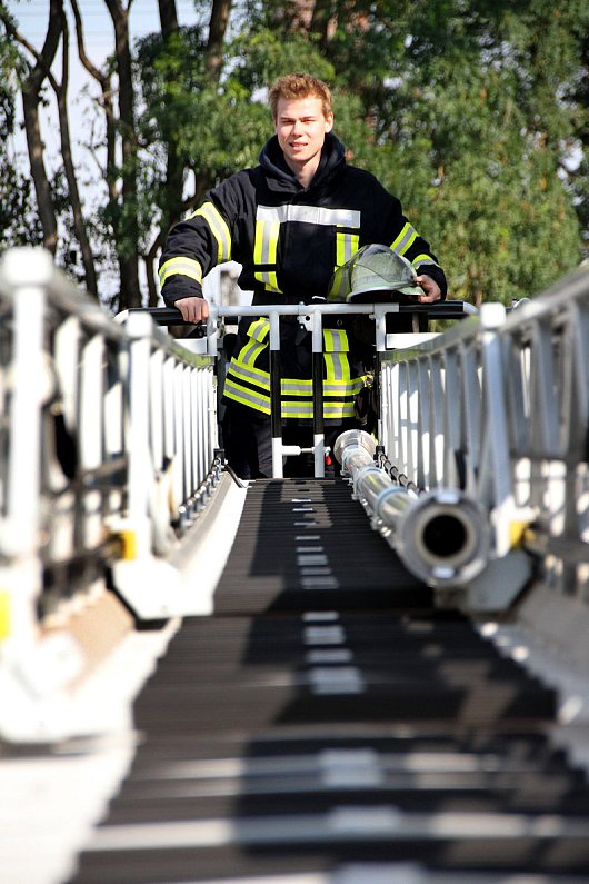 Stolz wie Oskar: NW-Mitarbeiter Johannes Wöpkemeier war für einen Tag Feuerwehrmann und erfüllt sich hier auf der Drehleiter einen Kindheitstraum. Schrill klingt der Alarm durch die Fahrzeughalle. "Verkehrsunfall in Volmerdingsen. Einsatz für das HLF und den Rüstwagen", sagt Christian Ostermann über die Lautsprecher durch. Einsatz...