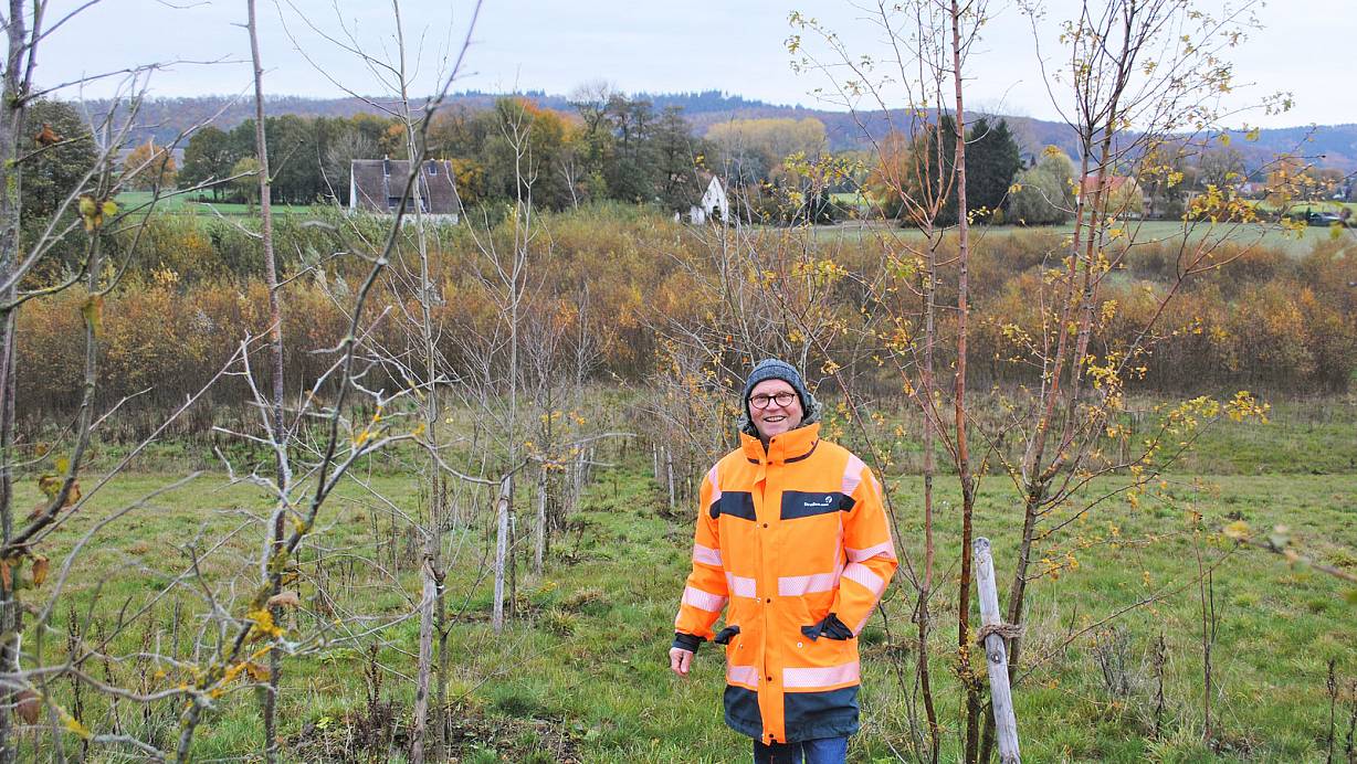 Zu den Langstreckenraketen gehört er eher nicht, lieber hangelt er sich in Wellenbewegungen von Baum zu Baum voran. Deshalb wurden seine zwei Wildbrücken auch mit einem Baumhoppingpfad bepflanzt. Den Mittelpunkt bildet eine Reihe von Obstbäumen. „Das sind alles alte Sorten. Aus den Früchten wird die Biostation Bethel demnächst Saft gewinnen“, erklärt Kämpfer. Zum Schutz vor hungrigen Kühen, die über die Brücke laufen, sind die Apfel-, Birnen-, Pflaumen- und Kirschbäume mit Stacheldraht umzäunt. Insgesamt wurden rund 1.000 Obstbäume gepflanzt. Aber nicht alle auf den beiden jeweils rund 40 Meter breiten Brücken für die Steinkäuze.