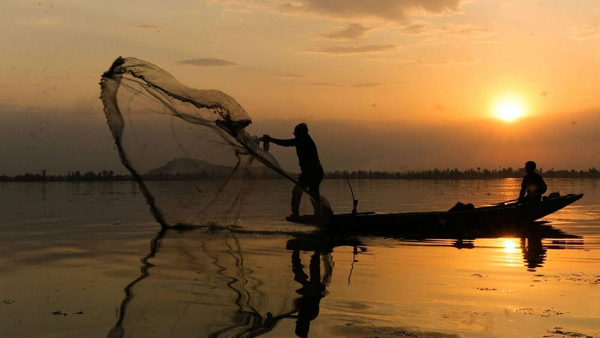 Ein kaschmirischer Fischer wirft sein Netz in den Dal-See. Nach Schätzungen sind etwa 34 Prozent der wilden Meeresfischbestände überfischt, 66 Prozent würden in biologisch nachhaltigem Ausmaß gefangen, heißt es in dem Bericht. | © Adil Abbas/ZUMA Press Wire/dpa