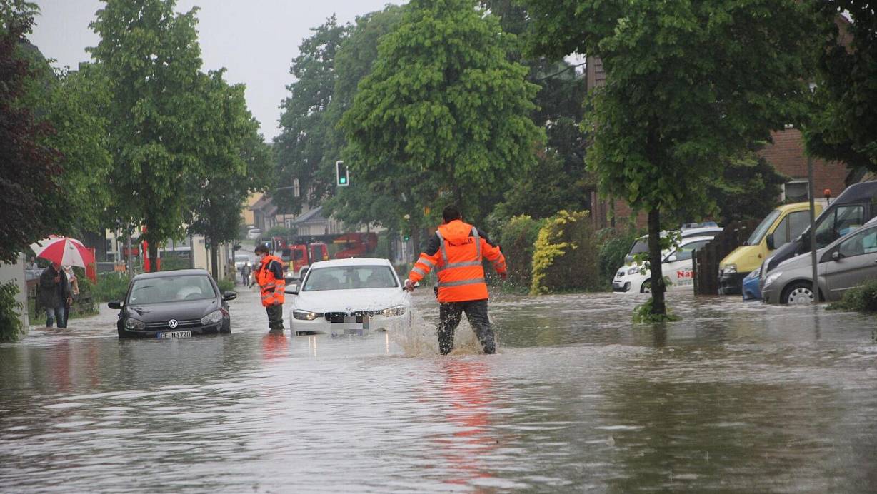 Feuerwehrleute helfen Autofahrern in Bünde, die nach dem Starkregen im Sommer 2022 auf der überfluteten Engerstraße feststecken. | © Florian Weyand