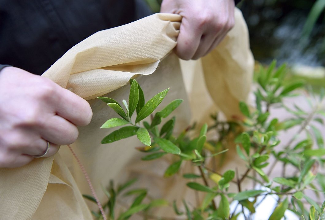 Auch rund um das Gefäß helfen Styropor und Noppenfolie die Kälte abzuhalten. Über das belaubte Astgerüst darf keine Plastikfolie gelegt werden, sondern vielmehr Jute oder Vlies. Es geht dabei nicht nur darum, die Kälte abzuhalten, sondern um eine Schattierung der Blätter, damit die Stoffwechselaktivität an sonnigen Spätwintertagen gedrosselt wird. Andernfalls kann es bei Frost zu Vertrocknungsschäden kommen.
