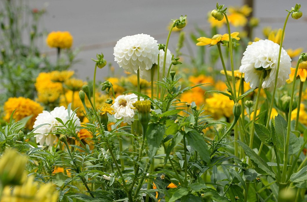 Wer im Frühling keine Dahlien gepflanzt hat, kann das jetzt nachholen. In vollsonnigen Beeten oder großen Töpfen auf Sonnenterrassen und -balkons fühlen sich Dahlien wohl. Sie zaubern in die abgeblühten Beete, wo sich Rosen und Sommerstauden wie Phlox und Margeriten verausgabt haben, frische Farben.